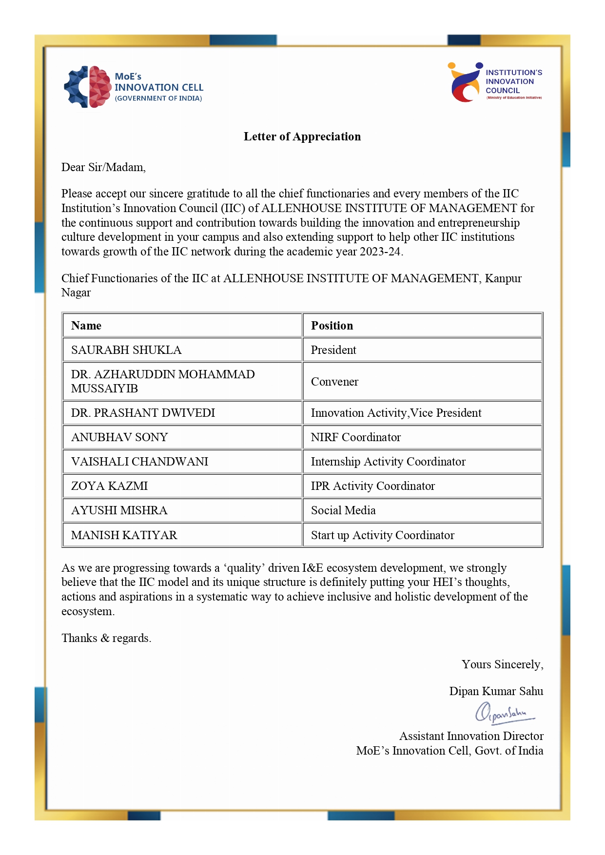 Letter of Appreciation 2023-24